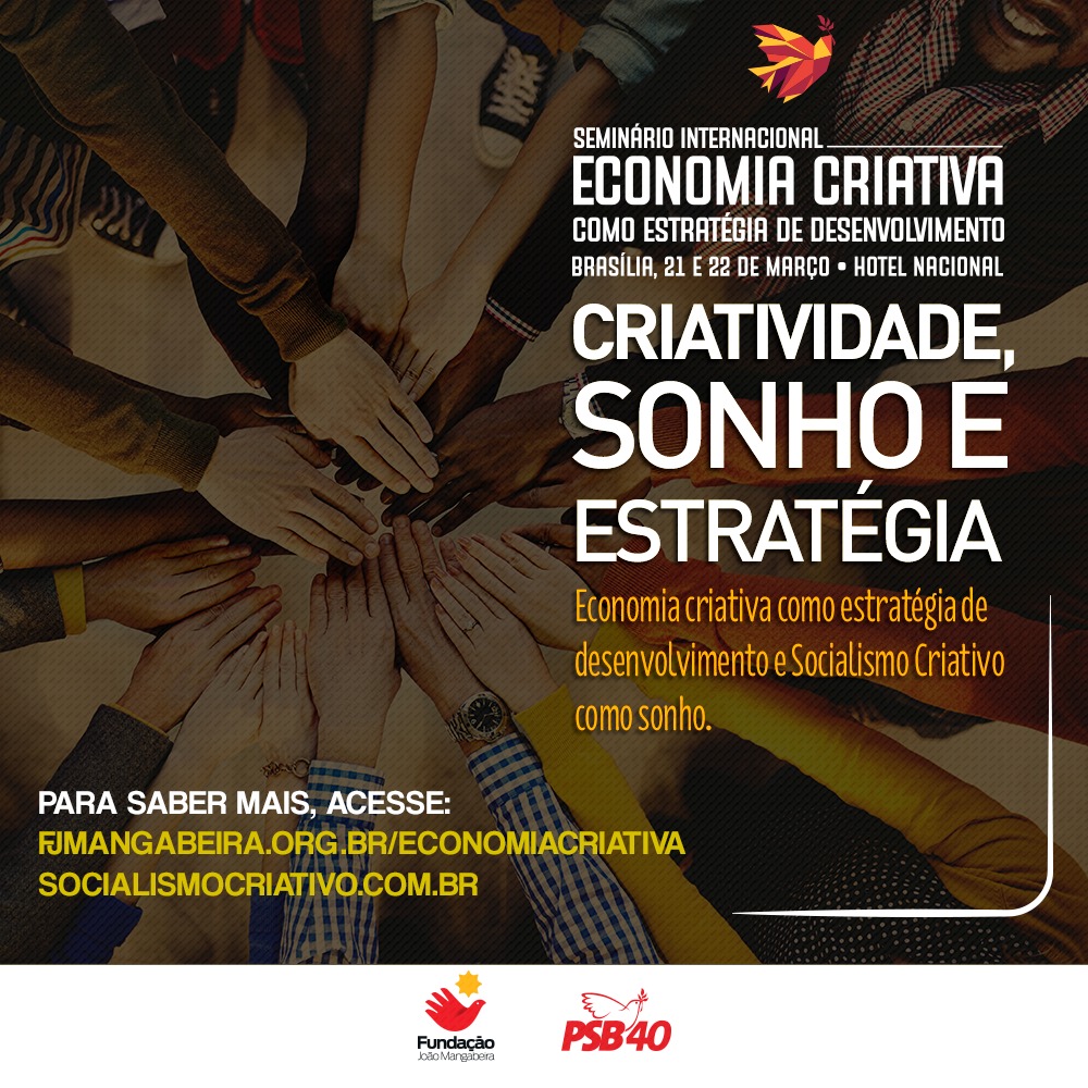 Economia criativa como estratégia de desenvolvimento e Socialismo Criativo como sonho, utopia moderna e revolucionária. É disso que o Partido Socialista Brasileiro está tratando como primeiro partido político brasileiro a adotar a economia criativa como um eixo estratégico em seu programa. E é para isso que promoverá, em Brasília (Hotel Nacional), nos próximos dias 21 e 22 de março, Seminário Internacional de Economia Criativa como Estratégia de Desenvolvimento, dando prosseguimento a temática desenvolvida no site www.socialismocriativo.com.br.